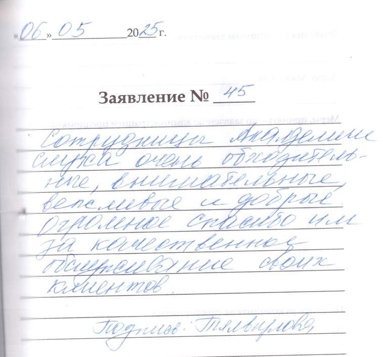 Хочу поблагодарить Елену Леонидовну и Татьяну за внимательное, доброе отношение к непростым пациентам. Их отзывчивость, понимание очень дорого нам, слабослышащим ! Спасибо Вам за Ваш труд и всего самого доброго Вам как в профессиональном, так и в личной жизни! С уважением афанасьева Л.В. 89214692025