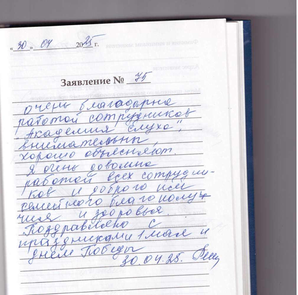 Очень благодарна работой сотрудников "Академия Слуха", внимательны, хорошо объясняют. Я очень довольна работой всех сотрудников и доброго им семейного благополучия и здоровья. Поздравляю с праздниками 1 мая и днем Победы