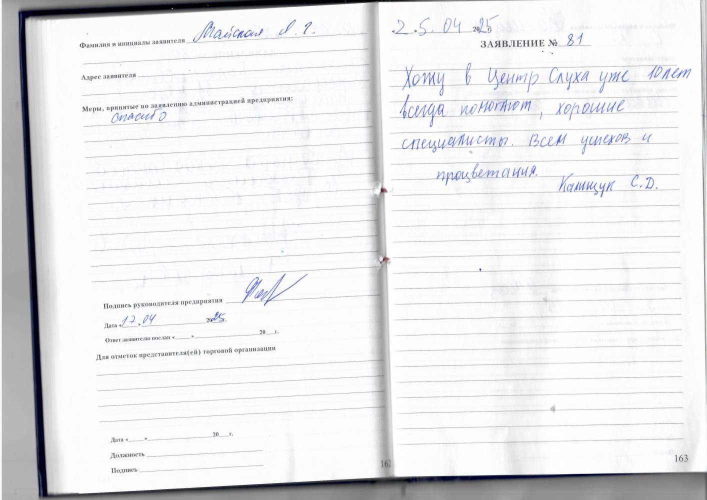 Хожу в Центр Слуха уже 10 лет всегда помогают, хорошие специалисты. Всем успехов и процветания. Калищук С.Д.