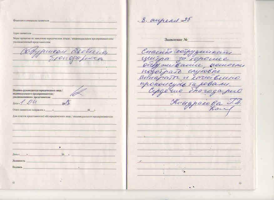 Спасибо сотрудникам центра за хорошее обслуживание, помогли подобрать слуховые аппараты и качественно проконсультировали. Сердечно благодарна.