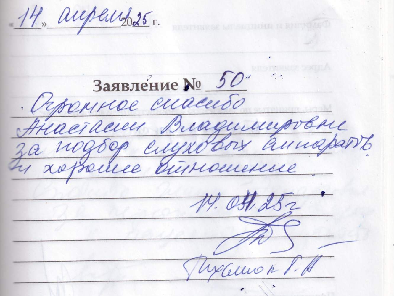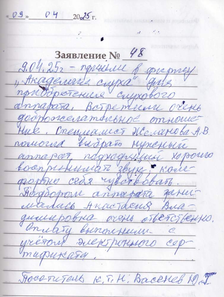 9.04.25 г.- пришли в фирму "Академия слуха" для приобретения слухового аппарата. Встретили очень доброжелательное отношение. Специалист Желанова А.В. помогла выбрать нужный аппарат, подходящий хорошо воспринимать звук, комфортно себя чувствовать. Подбором аппарата занималась Анастасия Владимировна очень ответственно. Оплату выполнили с учетом электронного сертификата.