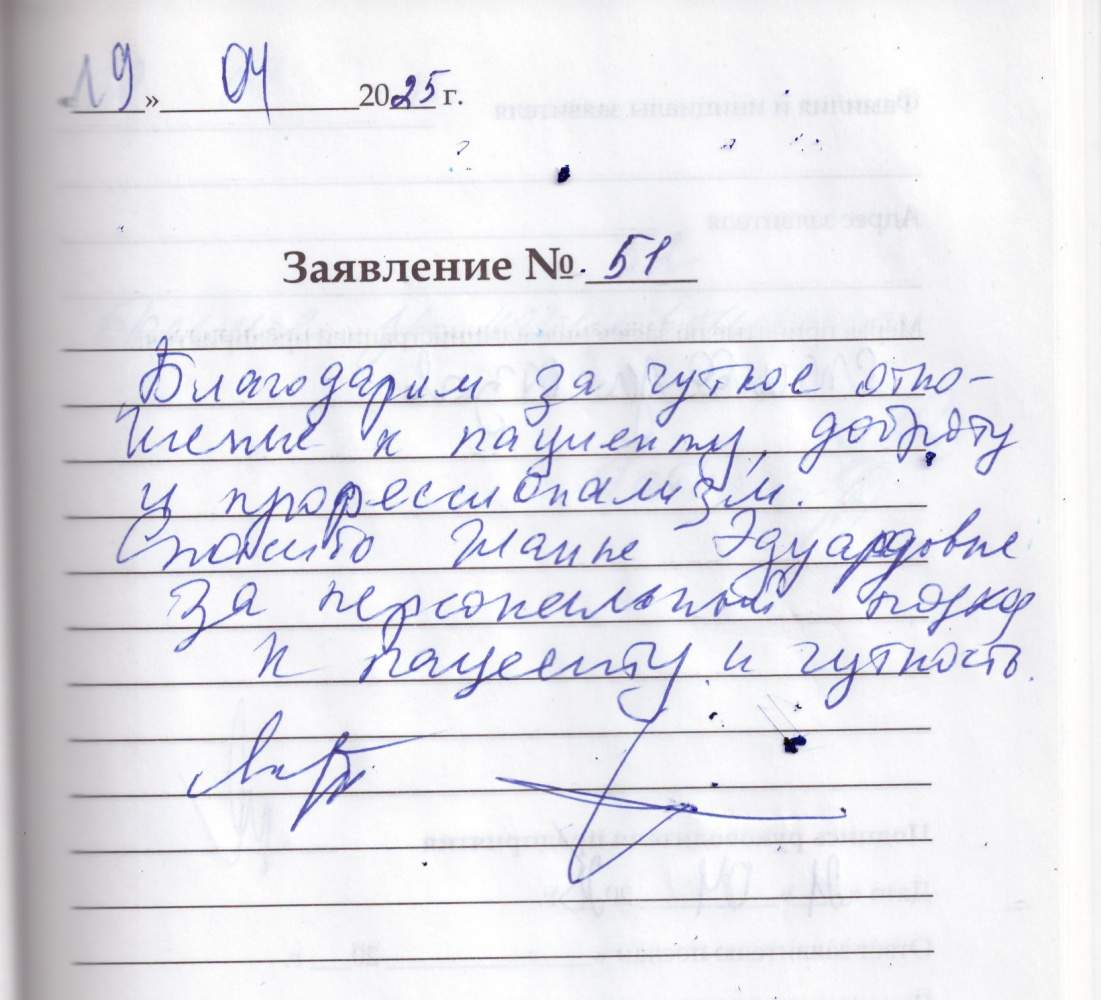 Благодарим за чуткое отношение к пациенту, доброту и профессионализм. Спасибо Жанне Эдуардовне за персональный подход к пациенту и чуткость.
