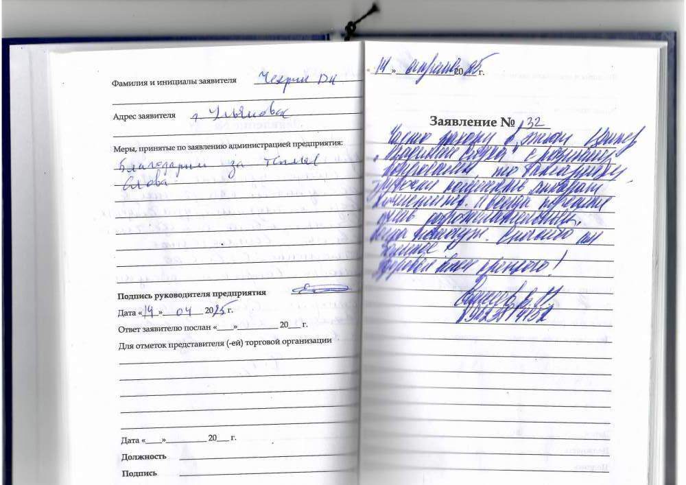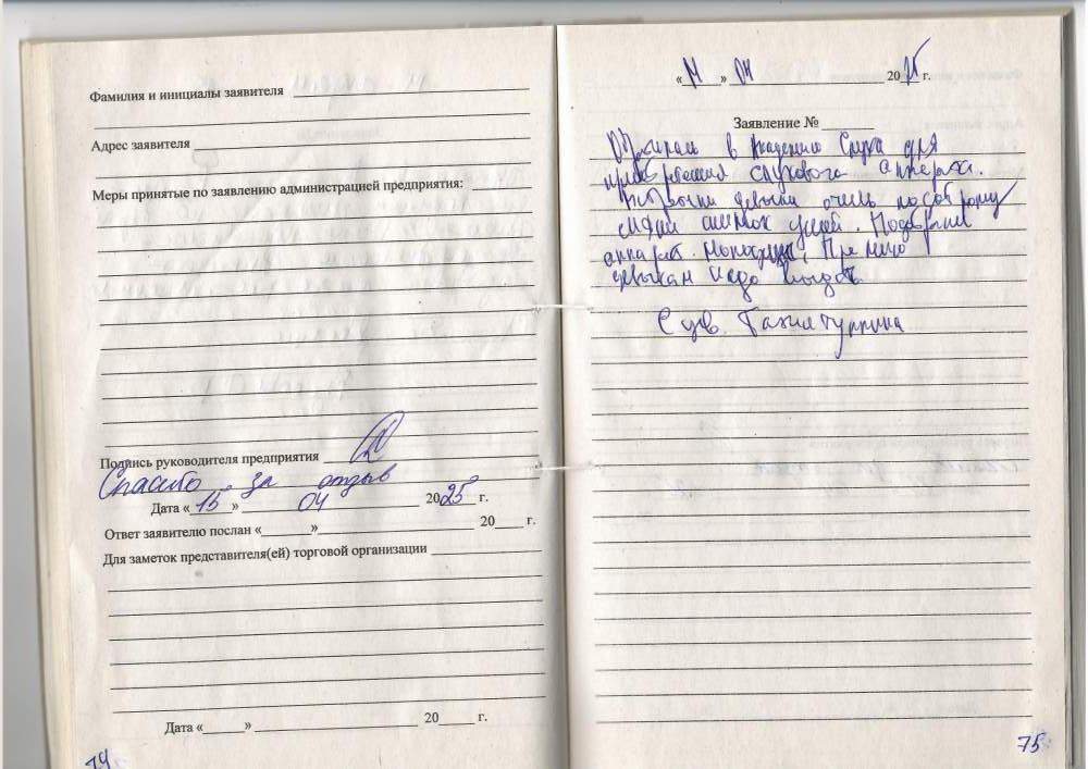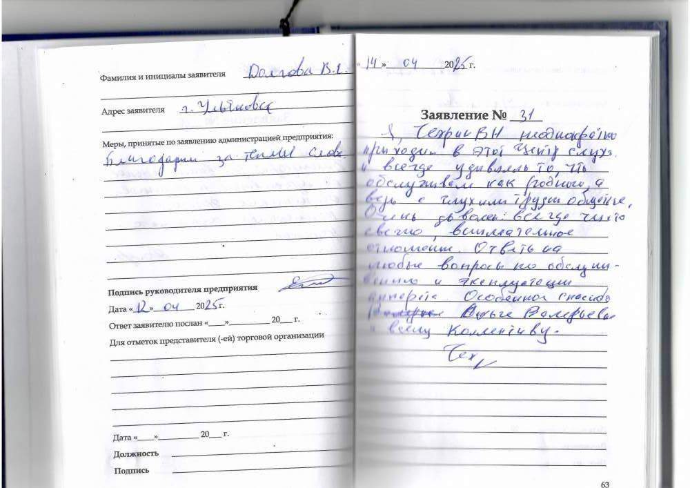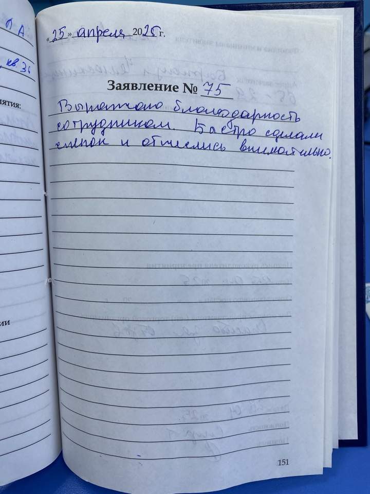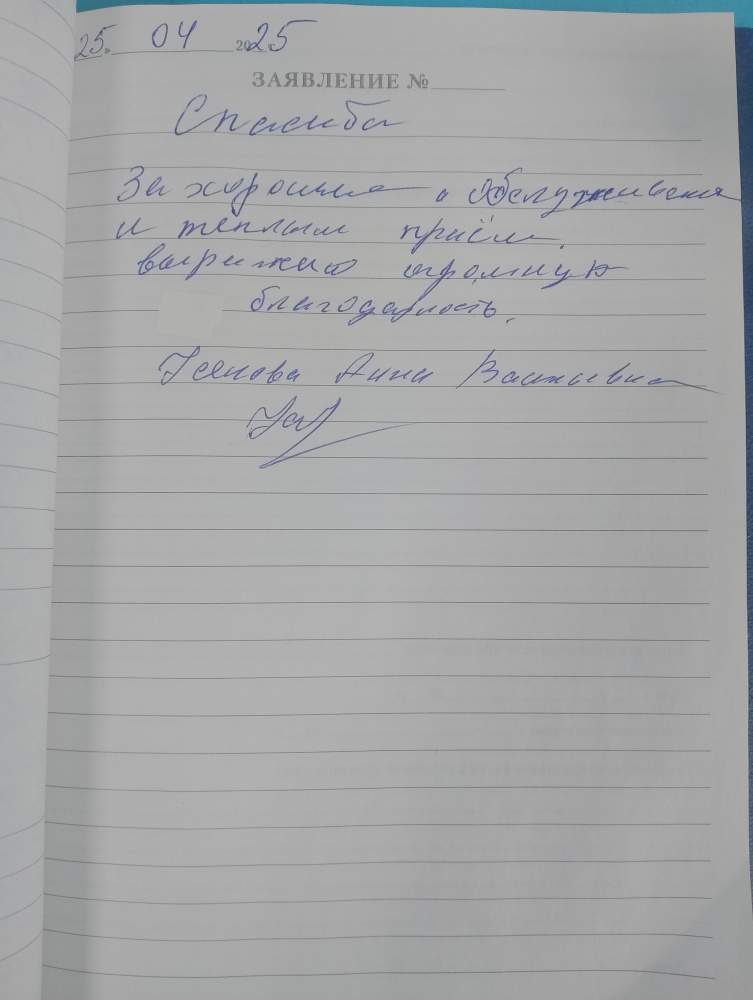 Спасибо за хорошее обслуживание и тёплый прием. Выражаю огромную благодарность.