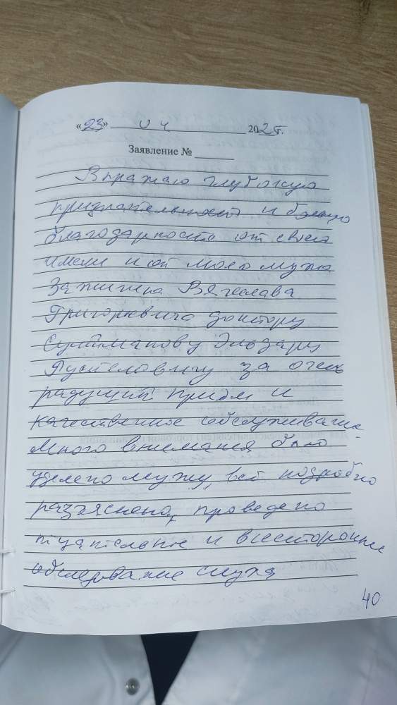 Выражаю глубокую признательность и большую благодарность от своего имени и от моего мужа Зажигина Вячеслава Григорьевича доктору Сулейманову Эльдару Рустемовичу за очень радушный прием и качественное облуживание. Много внимания было уделено мужу, все подробно разъяснено, проведено тщательное и всестороннее обследование слуха. Муж страдает прогрессирующей двухсторонней нейросенсорной тугоухостью с 1984 г. Инвалид по слуху. До приема Эльдара Рустемовича пожалуй никто так долго и очень внимательно не относся к Вячеславу, как доктор. Желаем доктору крепкого здоровья, всех благ и всего самого доброго! Считаем, что необходимо материально поощрить труд доктора, выдать премию и грамоту от организации. Людмила Максимовна, врас-терапевт