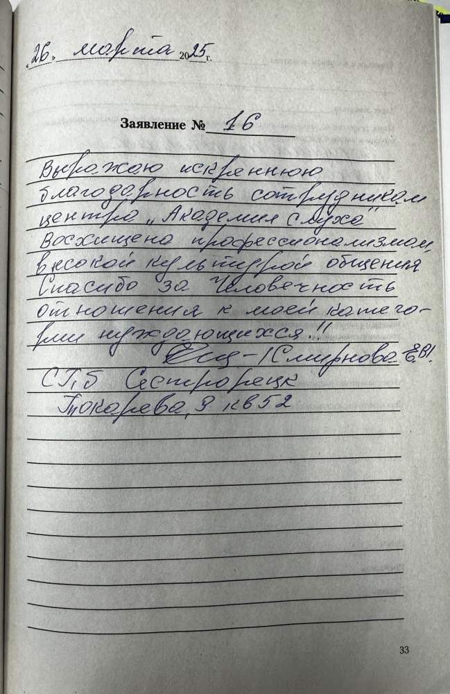Я, Никишина Т. В., хочу выразить благодарность сотрудникам центра за внимательное, доброе отношение к нам пенсионерам- инвалидам. Благодарим Вас за вашу работу.
