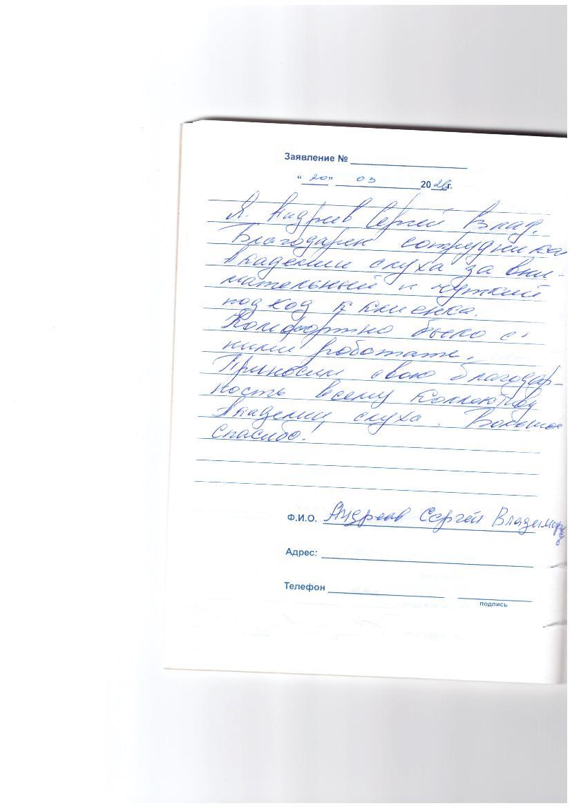 Я Андреев Сергей Владимирович. Благодарен сотрудникам Академии слуха за внимательный и чуткий подход к клиентке. Комфортно было с ними работать. Приносим свою благодарность всему коллективу Академии слуха. Большое спасибо!