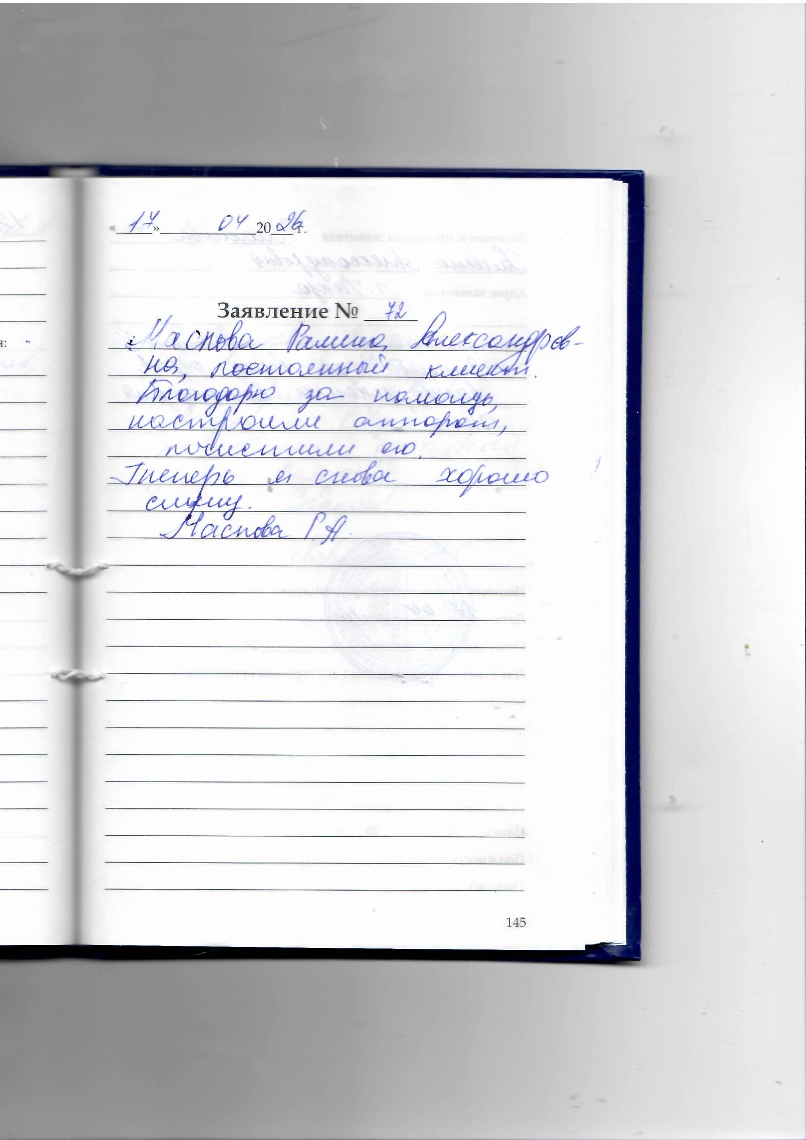 Маслова Галина Александровна, постоянный клиент благодарю за помощь, настроили аппарат, почистили его. Теперь я снова хорошо слышу.
