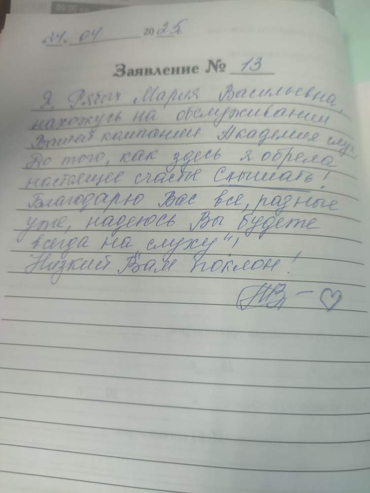 Я, Рябых Мария Васильевна нахожусь на обслуживании Вашей компании Академия Слуха. До того, как здесь я обрела настоящее счастье Слышать! Благодарю Вас все, родные уже, надеюсь Вы будете всегда на "слуху". Низкий Вам поклон!