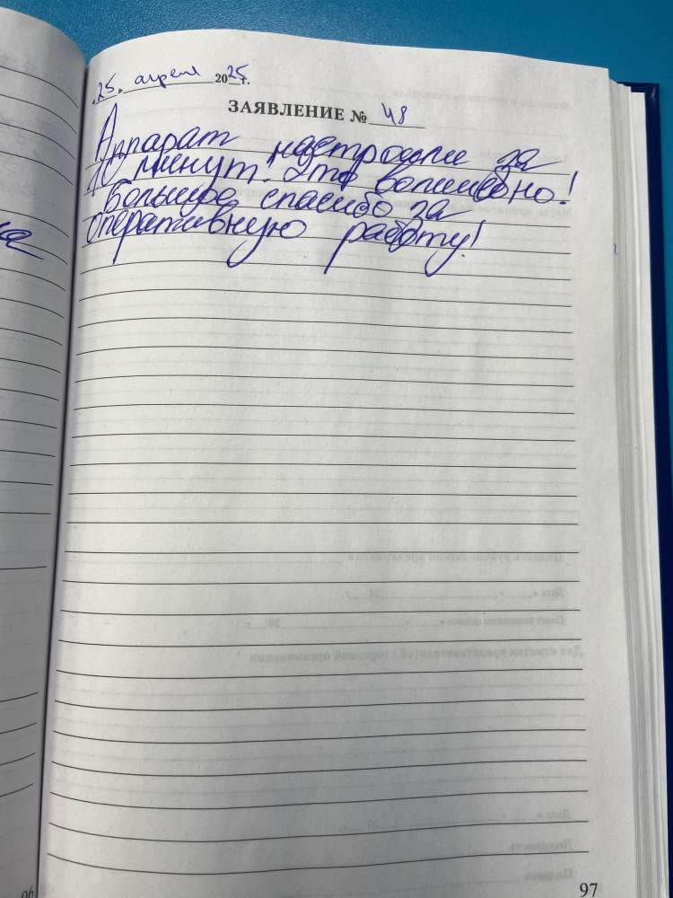 Аппарат настроили за 10 минут. Это великолепно. Большое спасибо за оперативную работу!