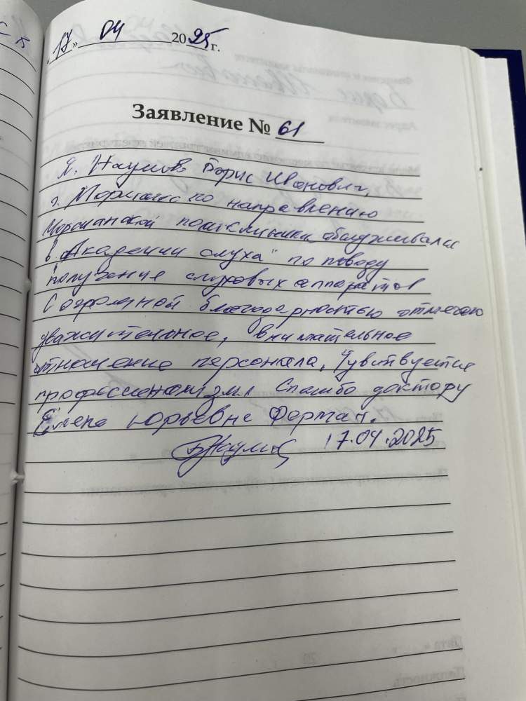 Я, Наумов Борис Иванович, г. Моршанск по направлению Моршанской поликлиники обслуживался в "Академии слуха" по поводу получения слуховых аппаратов.  С огромной благодарностью отмечаю уважительное, внимательное отношение персонала. Чувствуется профессионализм. Спасибо доктору Елене Юрьевне Ферман
