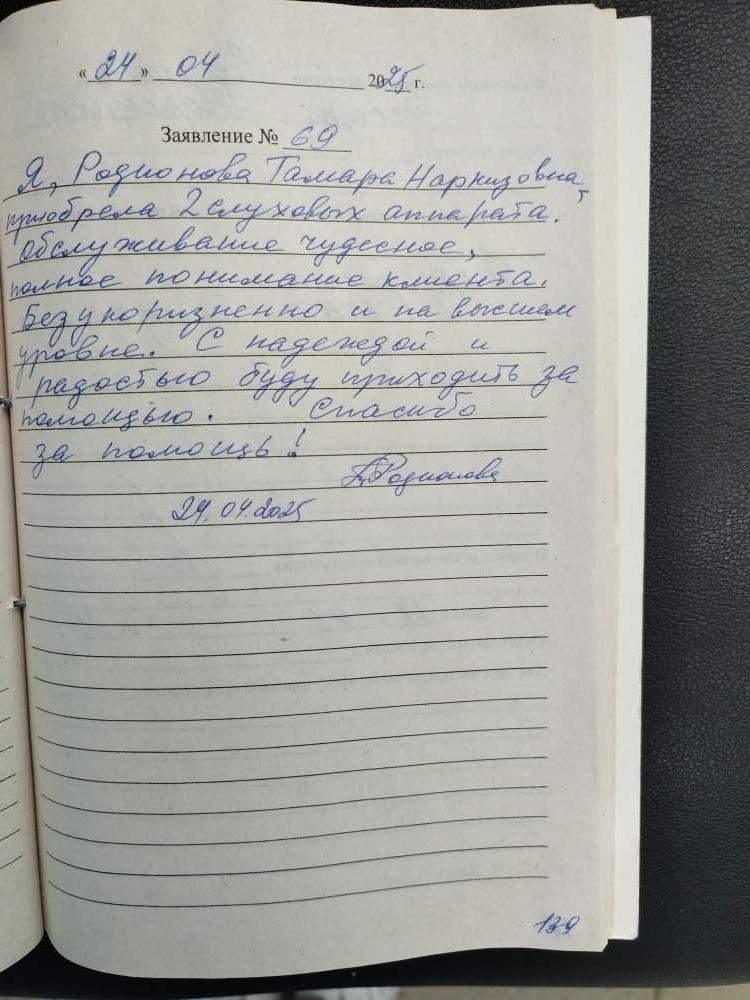 Я, Родионова Тамара Наркизовна приобрела два слуховых аппарата. Обслуживание чудесное, полное понимание клиента. Безукоризненно и на высшем уровне. С надеждой и радостью буду приходить за помощью. Спасибо за помощь!