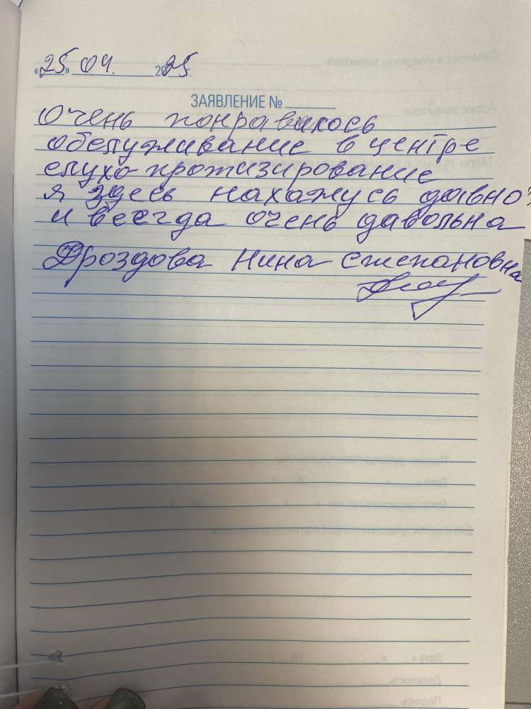 Очень понравилось обслуживание в центре слухо-протезирование я здесь нахожусь давно и всегда очень довольна. Дроздова Нина Степановна