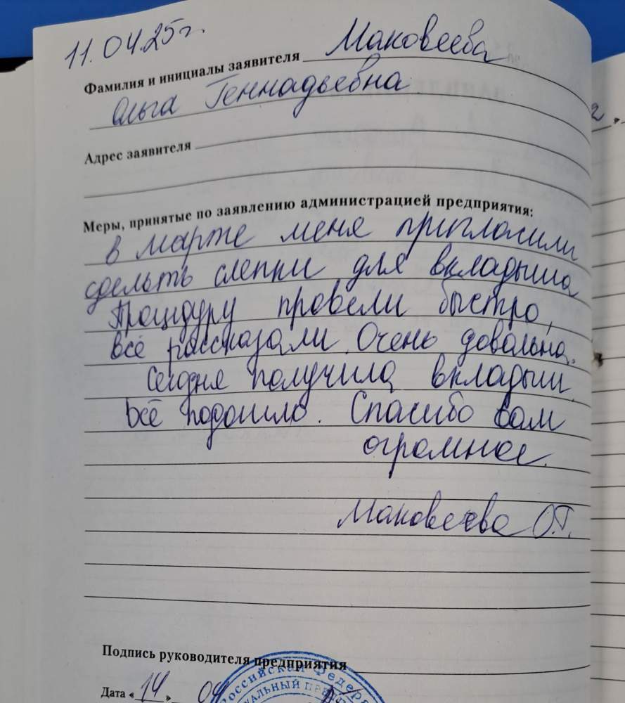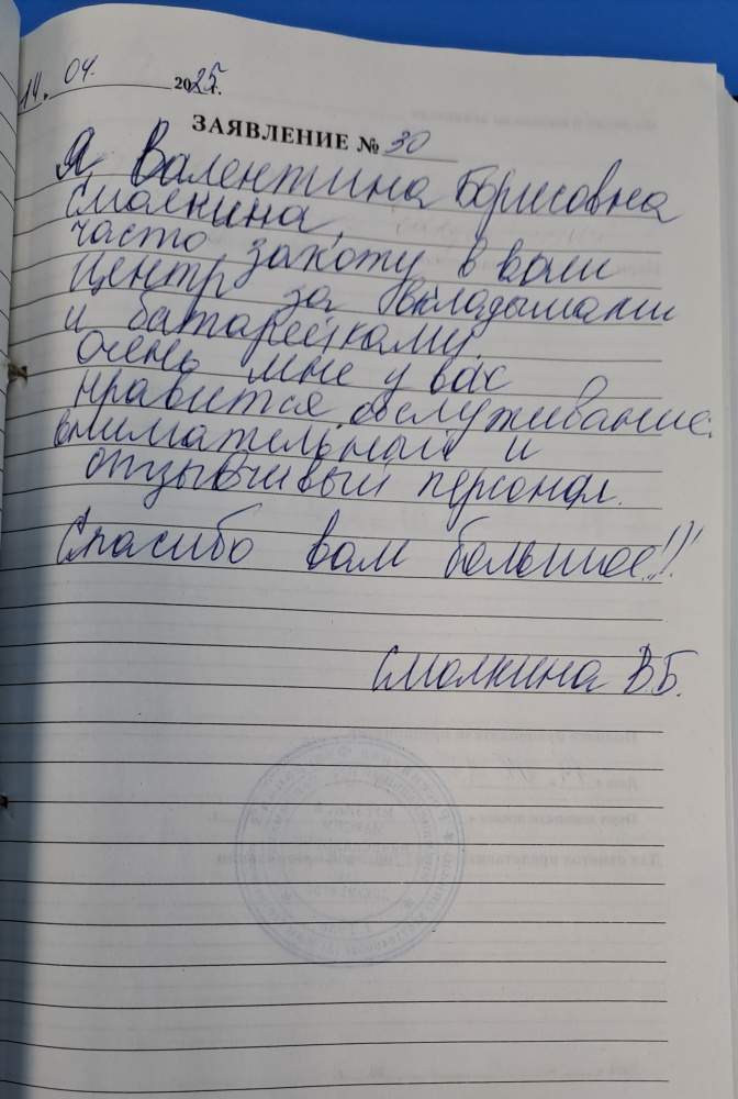 Я, Валентина Борисовна Смолкина, часто захожу в ваш центр за вкладышами и батарейками. Очень мне у вас нравиться обслуживание, внимательный и отзывчивый персонал. Спасибо вам большое!!!