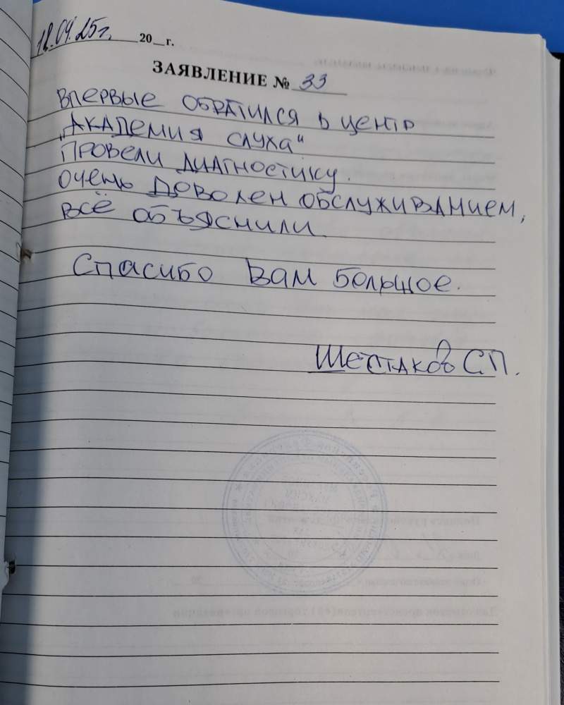 Впервые обратился в центр " Академия Слуха" Провели диагностику. Очень доволен обслуживанием. Все объяснили. Спасибо вам большое.