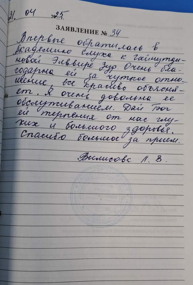 Впервые обратилась в Академию слуха к Гайнутдиновой Эльвире Зур. Очень благодарна ей за чуткое отношение, все красиво объясняет. Я очень довольна ее обслуживанием. Дай Бог ей терпения от нас глухих и большого здоровья. спасибо большое за прием.