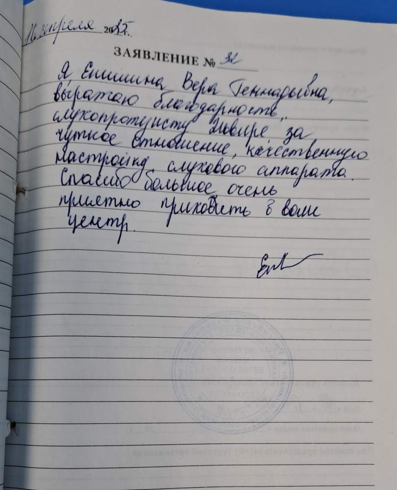 Я, Епишина Вера Геннадьевна, выражаю благодарность, слухопротезисту Эльвире за чуткое отношение , качественную настройку слухового аппарата. Спасибо большое, очень приятно приходить в ваш центр.