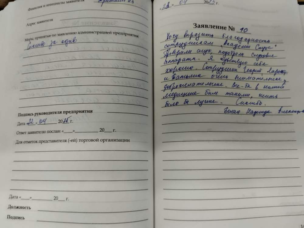 Хочу выразить благодарность сотрудникам "Академии Слуха" Проверили слух, подобрали слуховые аппараты. Я чувствую себя хорошо. Сотрудники Георгий, Лариса и Татьяна очень внимательные, доброжелательные. Все-бы в нашей медицине были такими, жить было бы лучше. Спасибо!