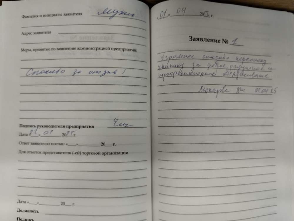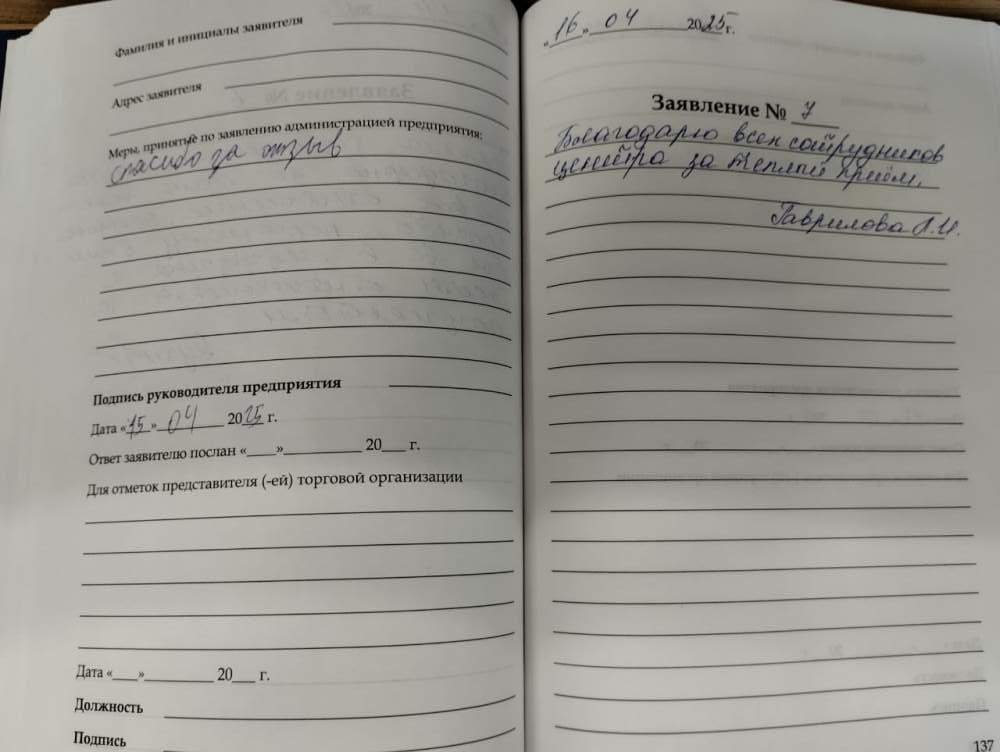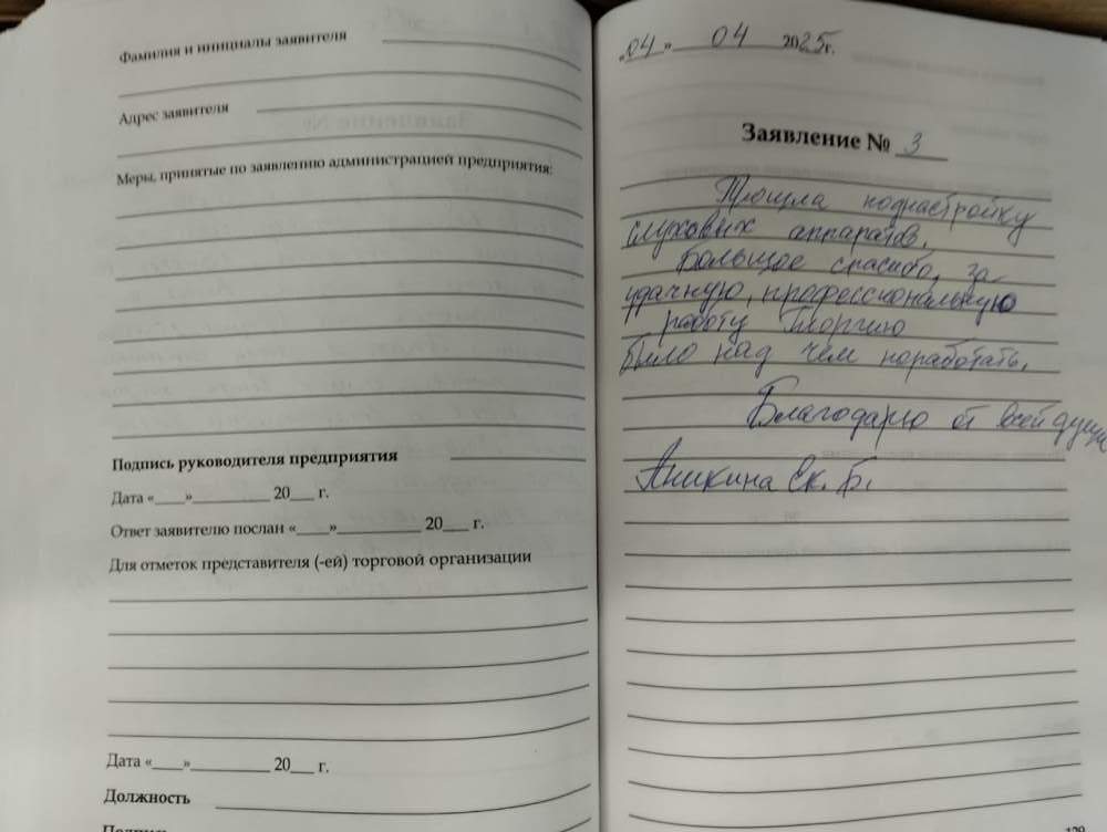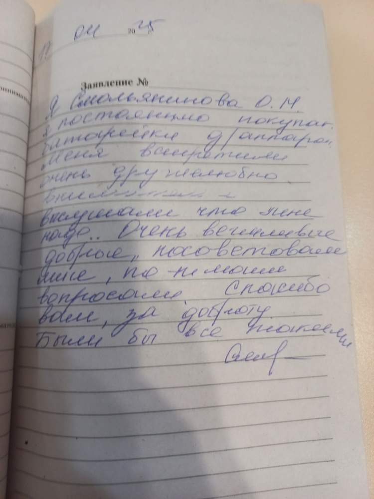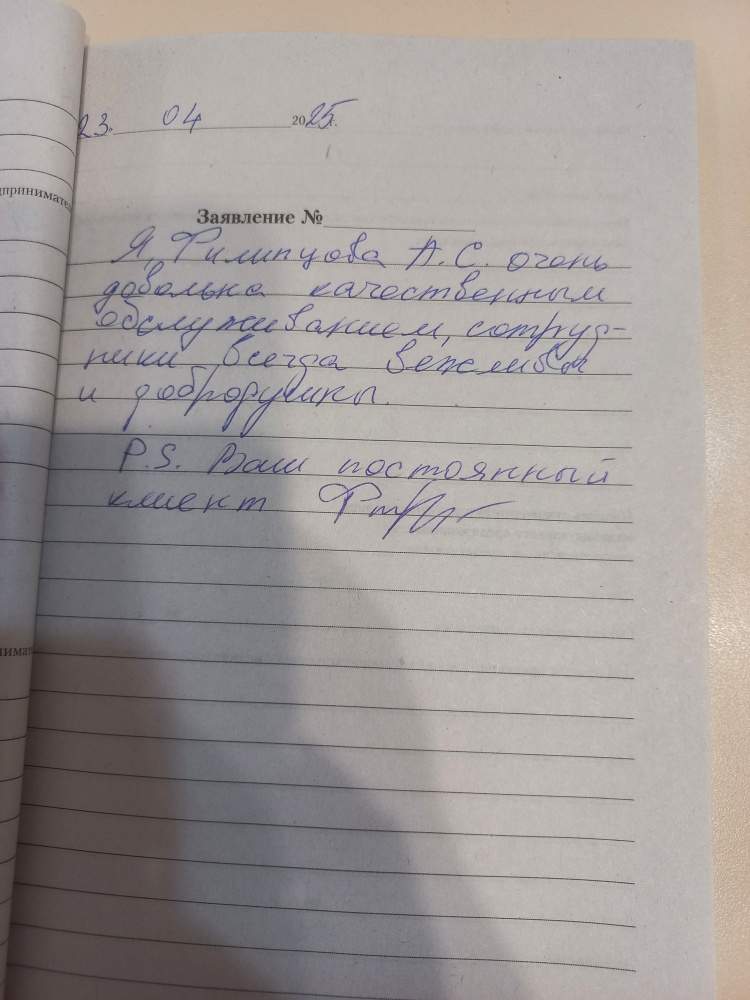 24.04.2025 Я, Филипцова А.С. очень довольна качественным обслуживанием, сотрудники всегда вежливые и добродушны. P.S. Ваш постоянный клиент.