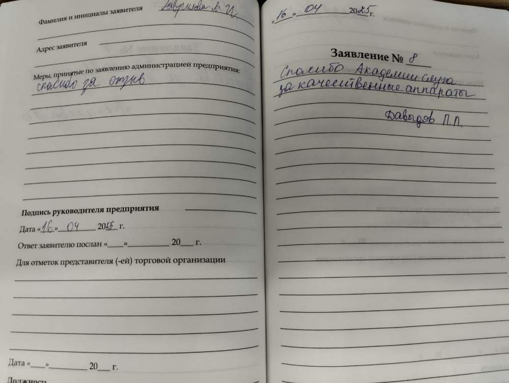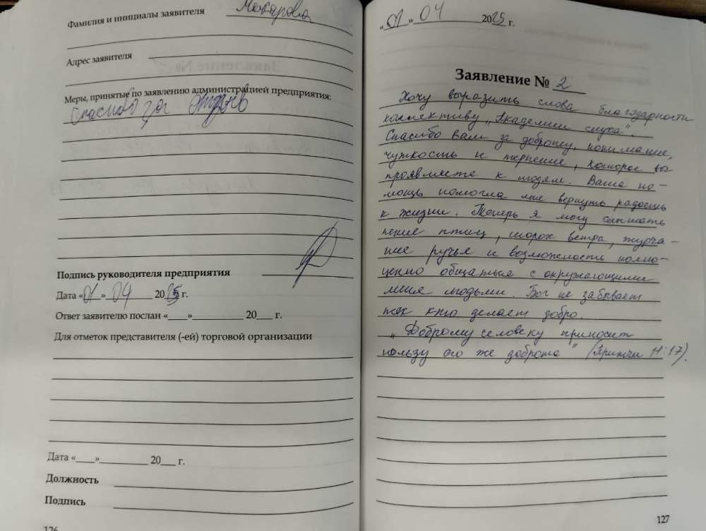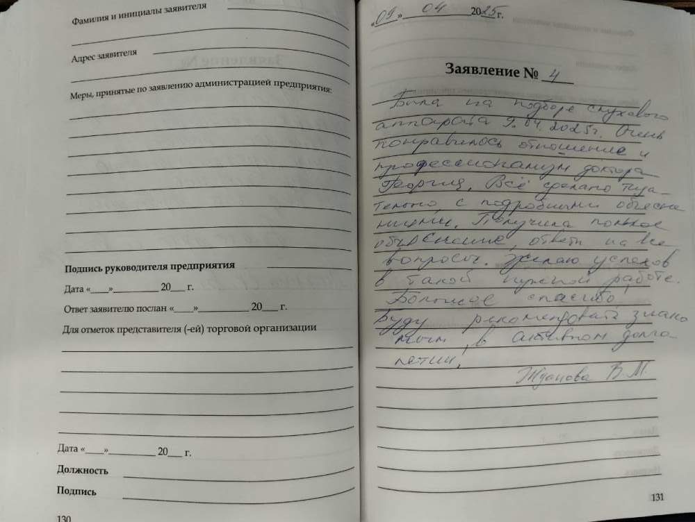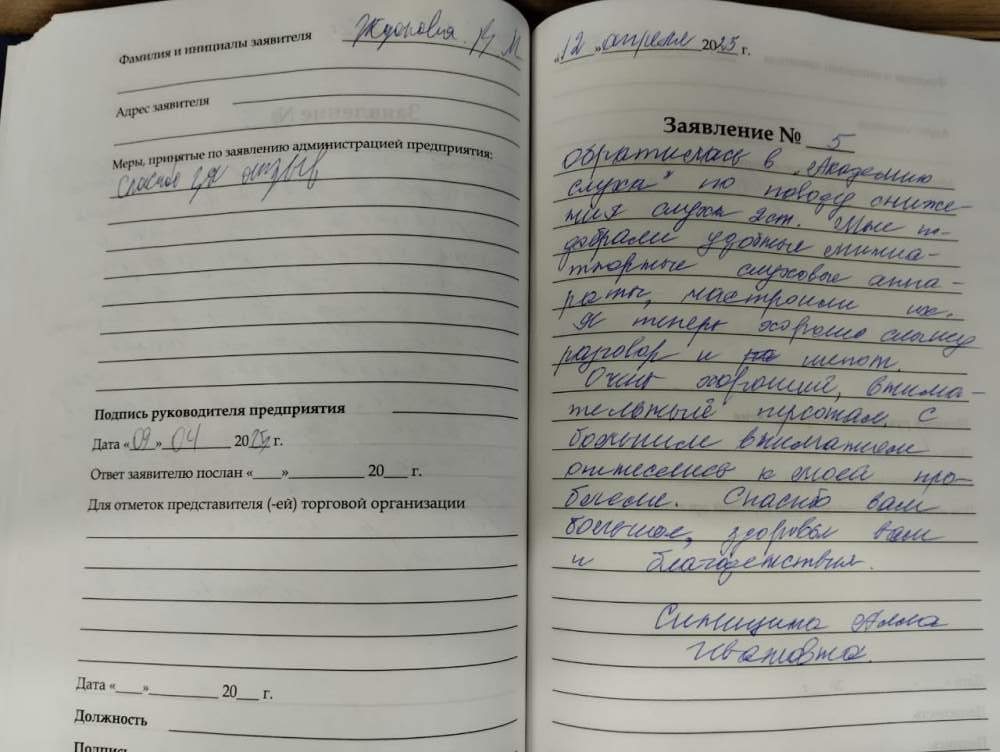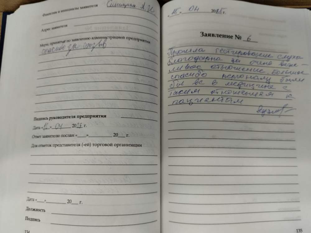 24.04.2025 Я, Филипцова А.С. очень довольна качественным обслуживанием, сотрудники всегда вежливые и добродушны. P.S. Ваш постоянный клиент.