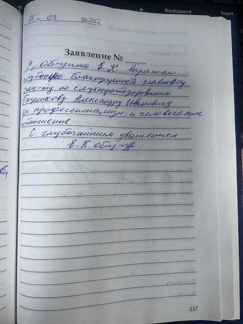 Я, Обидина Е.К., выражаю глубокую благодарность главному специалисту по слухопротезированию Бирюкову Александру Ивановичу за профессионализм и человеческое отношение.