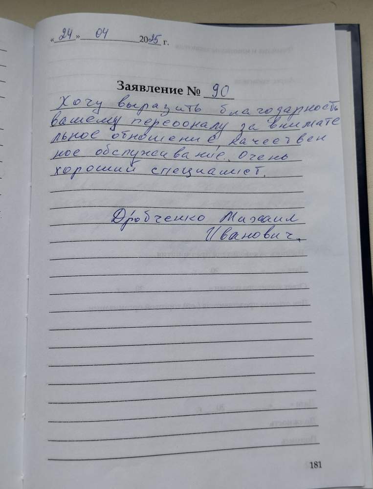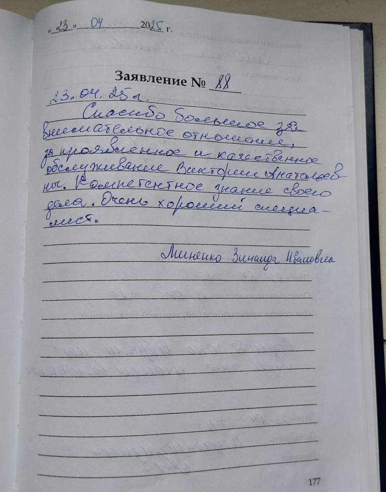 Хочу выразить благодарность вашему персоналу за внимательное отношение, качественное обслуживание. Очень хороший специалист.