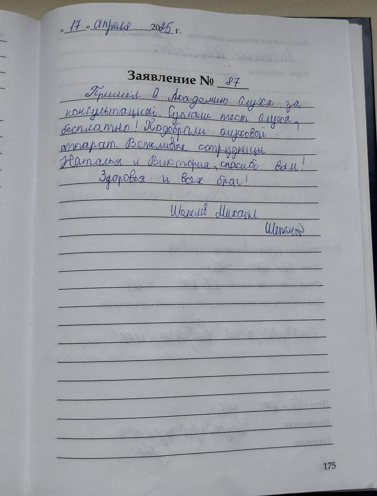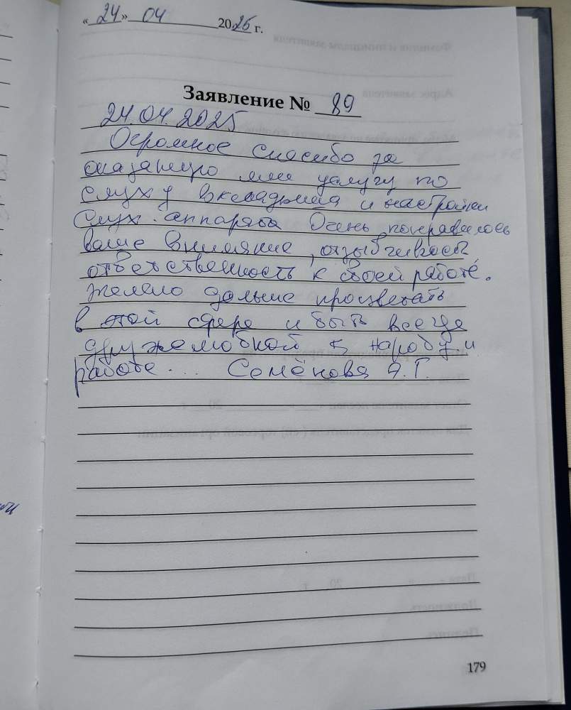 Огромное спасибо за оказанную мне услугу по слуху, вкладыша и настройки слухового аппарата. Очень понравилось ваше внимание, отзывчивость, ответственность к своей работе. Желаю дальше процветать в этой сфере и быть всегда дружелюбной к народу и работе…