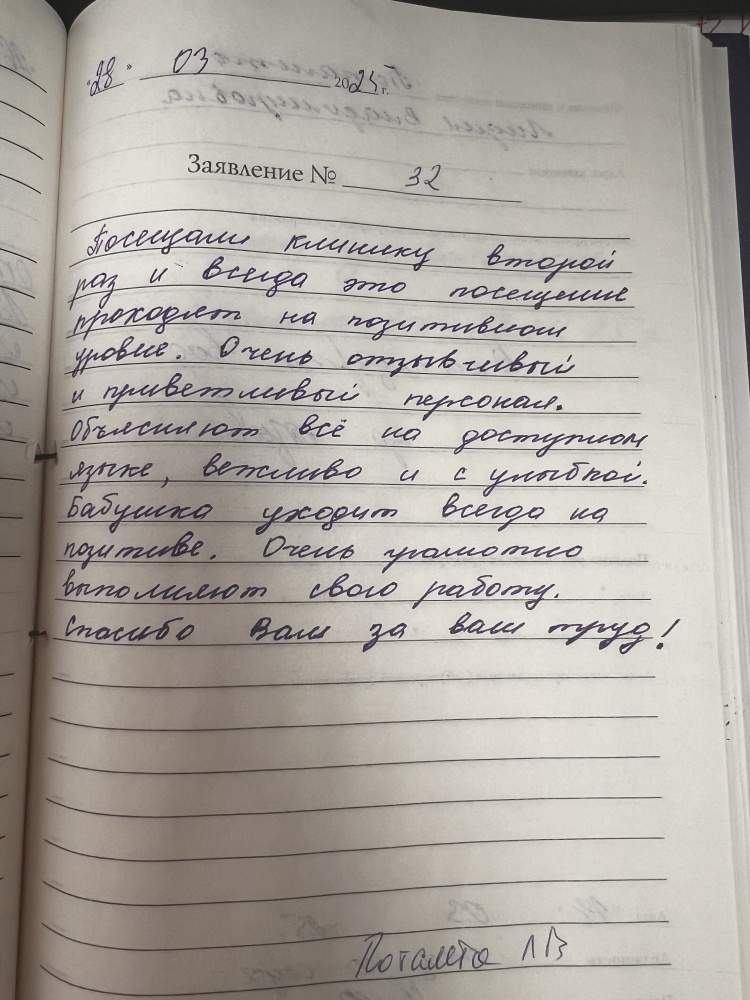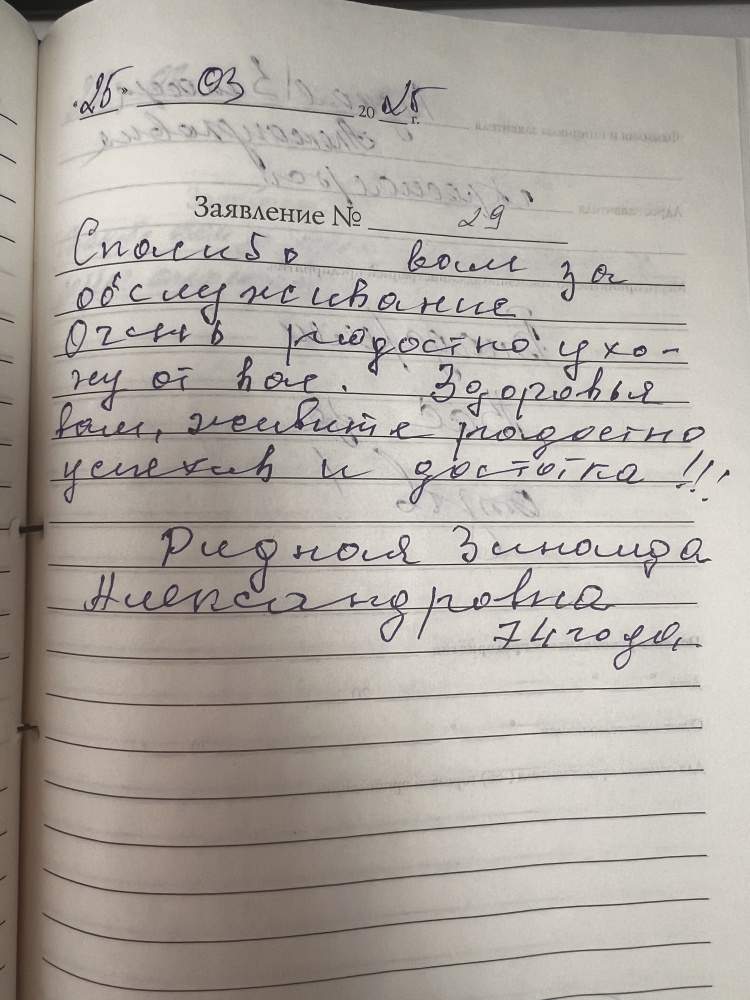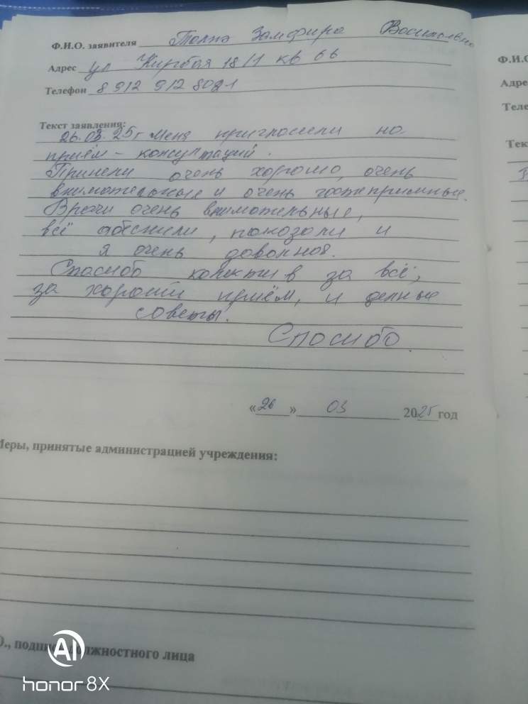 26.03.2025 г меня пригласили на прием- консультацию. Приняли очень хорошо, очень внимательные и очень гостеприимные. Врачи очень внимательные, все объяснили, показали и я очень довольна. Спасибо коллективу за все, за хороший прием. и данные советы.