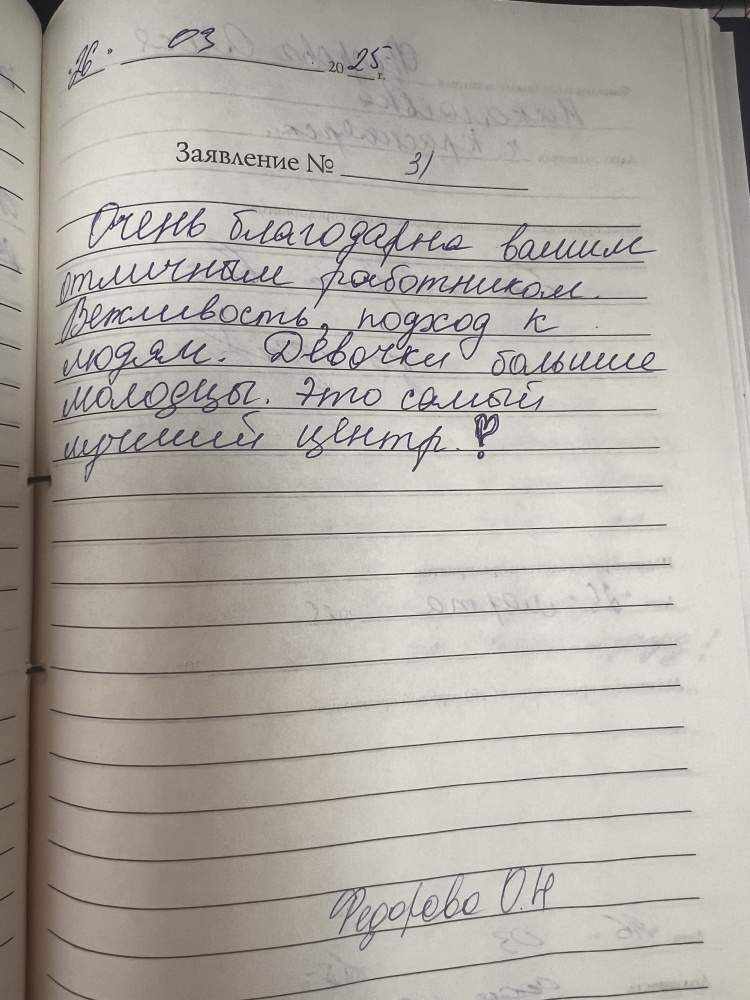 Очень благодарна вашим отличным работникам. Вежливость , подход к людям . девочки большие молодцы. это самый лучший центр !