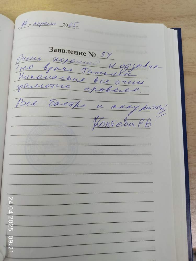 Очень хороший и отзывчивый врач Татьяна Николаевна, все очень грамотно провела. Все быстро и аккуратно