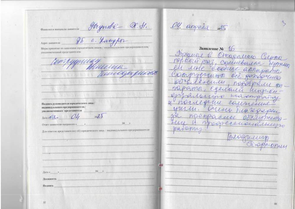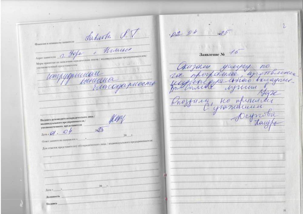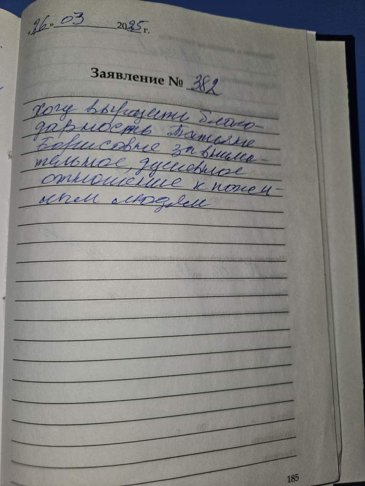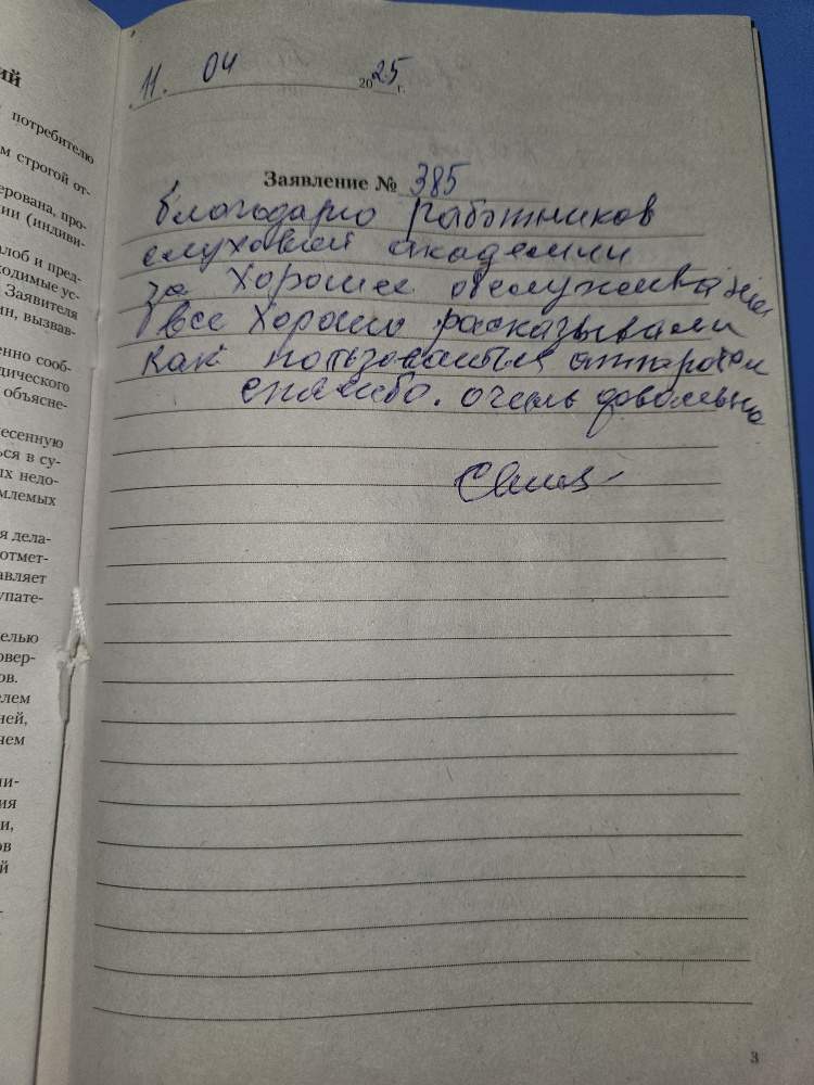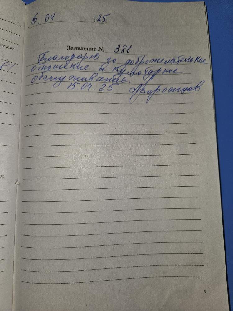 Благодарю за доброжелательное отношение и культурное обслуживание. 15.04.25 Ворожцов Л.И. г. С- Петербург