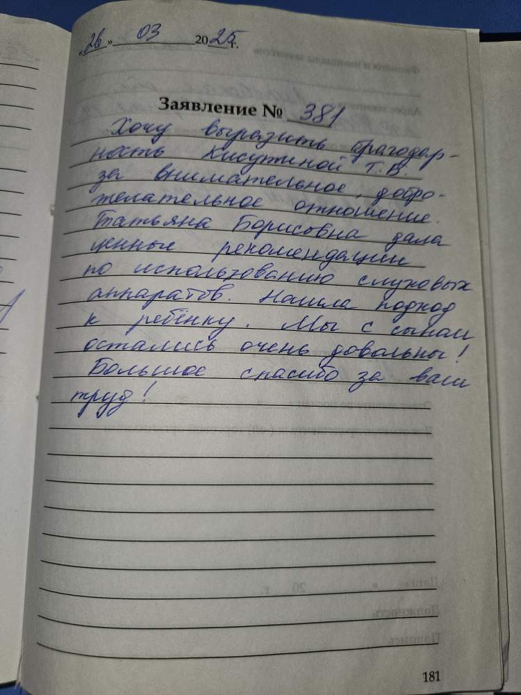 Хочу выразить благодарность Кисутиной Т.Б. за внимательное, доброжелательное отношение. Татьяна Борисовна дала ценные рекомендации по использованию слуховых аппаратов. Нашла подход к ребёнку. Мы с сыном остались очень довольны! Большое спасибо за ваш труд! Унжакова О.В. Кировская обл., пгт. Пижанка, ул.Северная 19-1