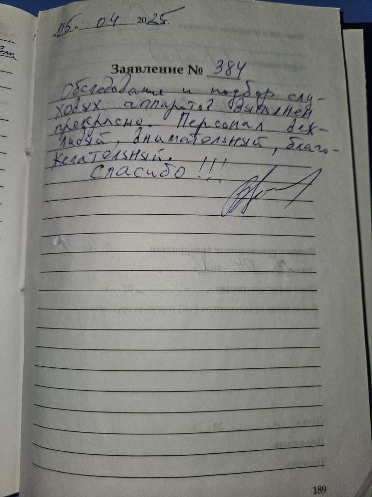 Обследование и подбор слуховых аппаратов выполнен прекрасно. Персонал вежливый, внимательный, благожелательный. Спасибо !!! Лебедько В.В г.Киров