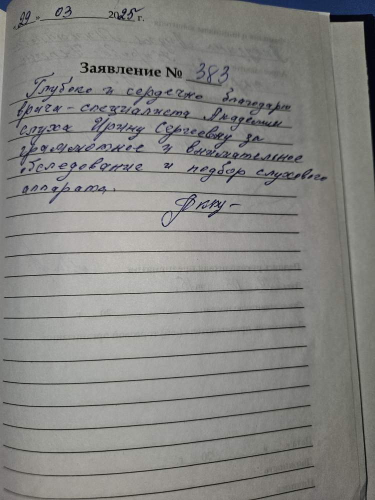 Глубоко и сердечно благодарю врача-специалиста Академии Слуха Ирину Сергеевну за граммотное и внимательное обследование и подбор слухового аппарата. Аккузина Лидия Михайловна г. Кирово-Чепецк мкр. Каринторф