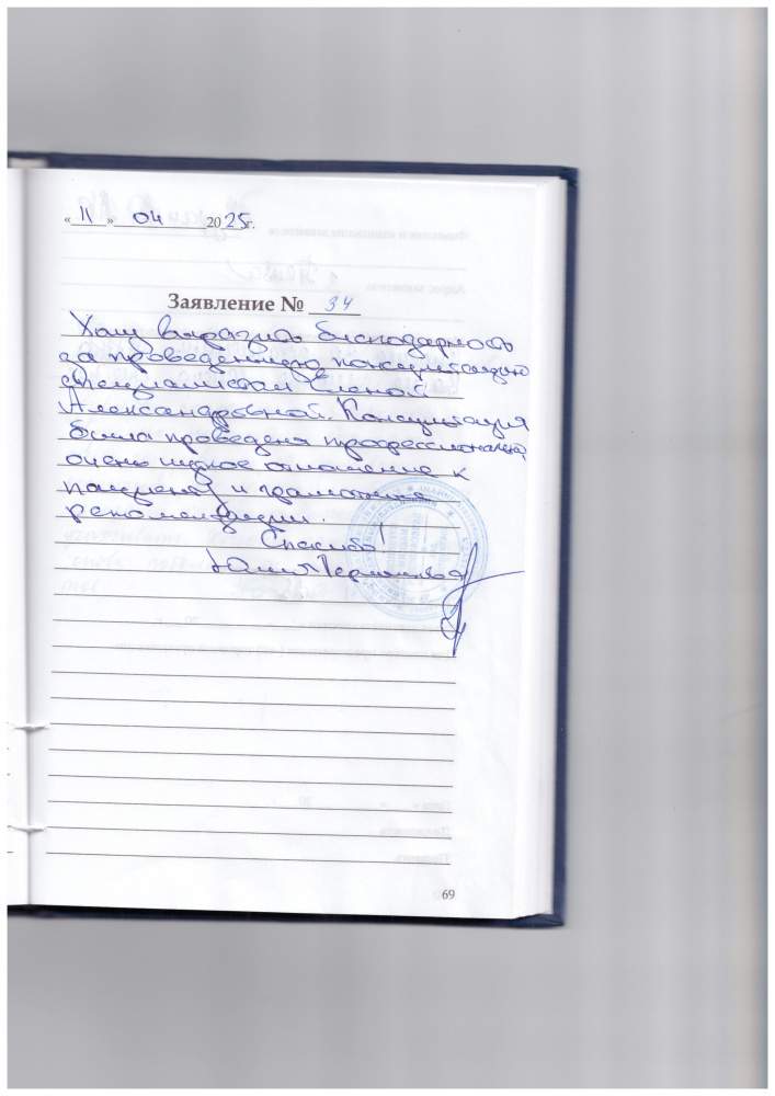 Хочу выразить благодарность за проведенную консультацию специалистом Еленой Александровной. Консультация была проведена профессионально, очень чуткое отношение к пациенту и грамотные рекомендации. Спасибо.