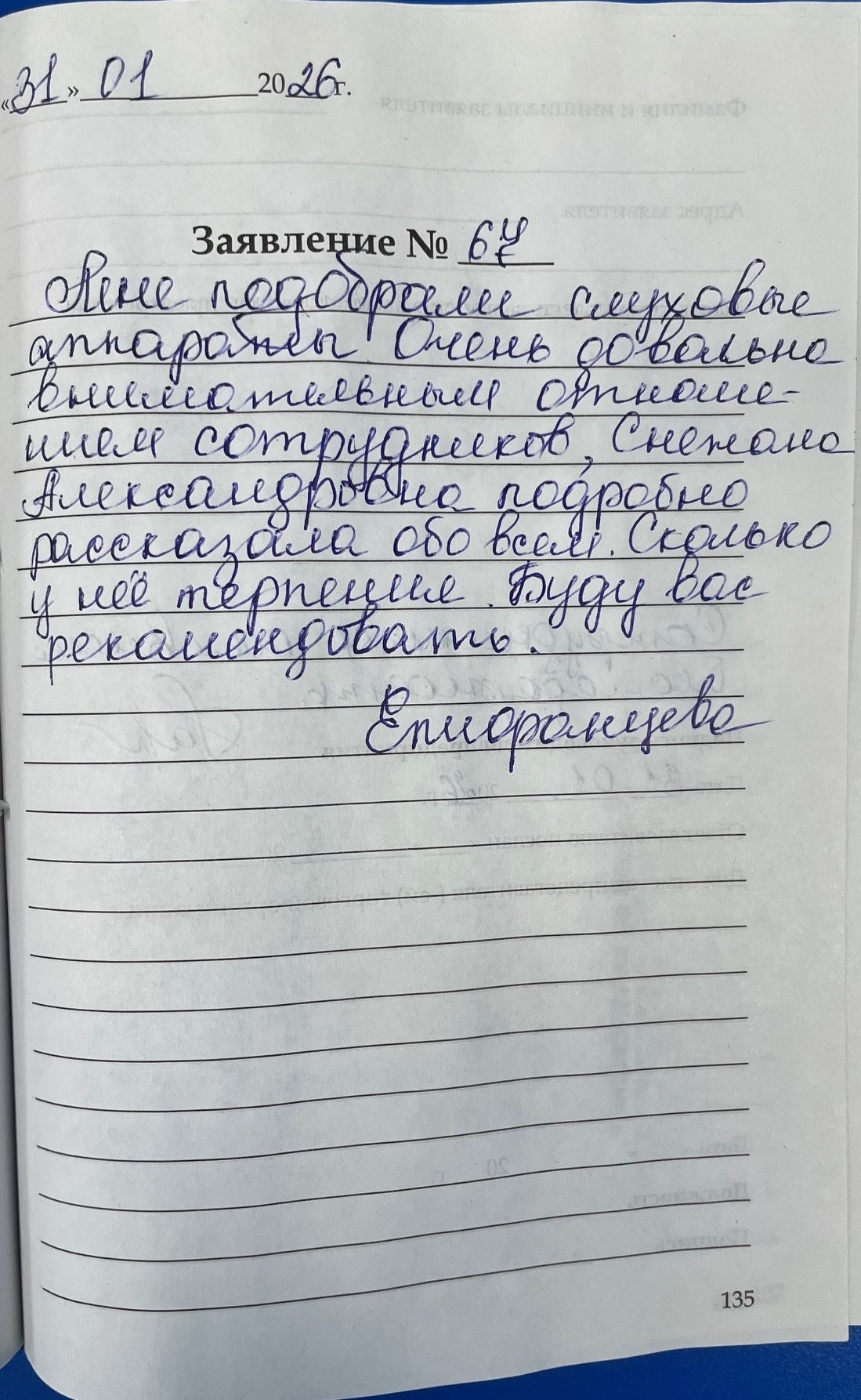 Позвонила, все объяснили, приехала, прошла прием. Как хорошо, что вы есть у нас. Спасибо Вам. Какие все обходительные. Аппараты носить буду с удовольствием. И про вас всем расскажу. Как хорошо все слышать. Здоровья Вам.