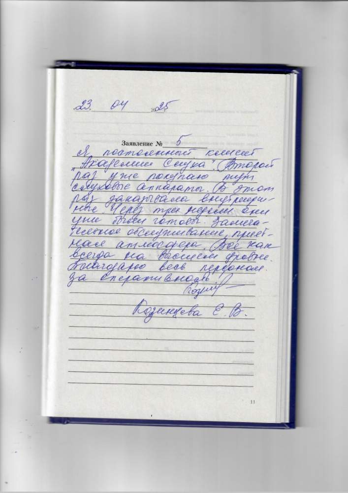 24.04.2025 Я, Воронцова Алина Александровна выражаю благодарность сотрудникам центра Академия слуха за качественное обслуживание( быстро, с добротой и улыбкой)