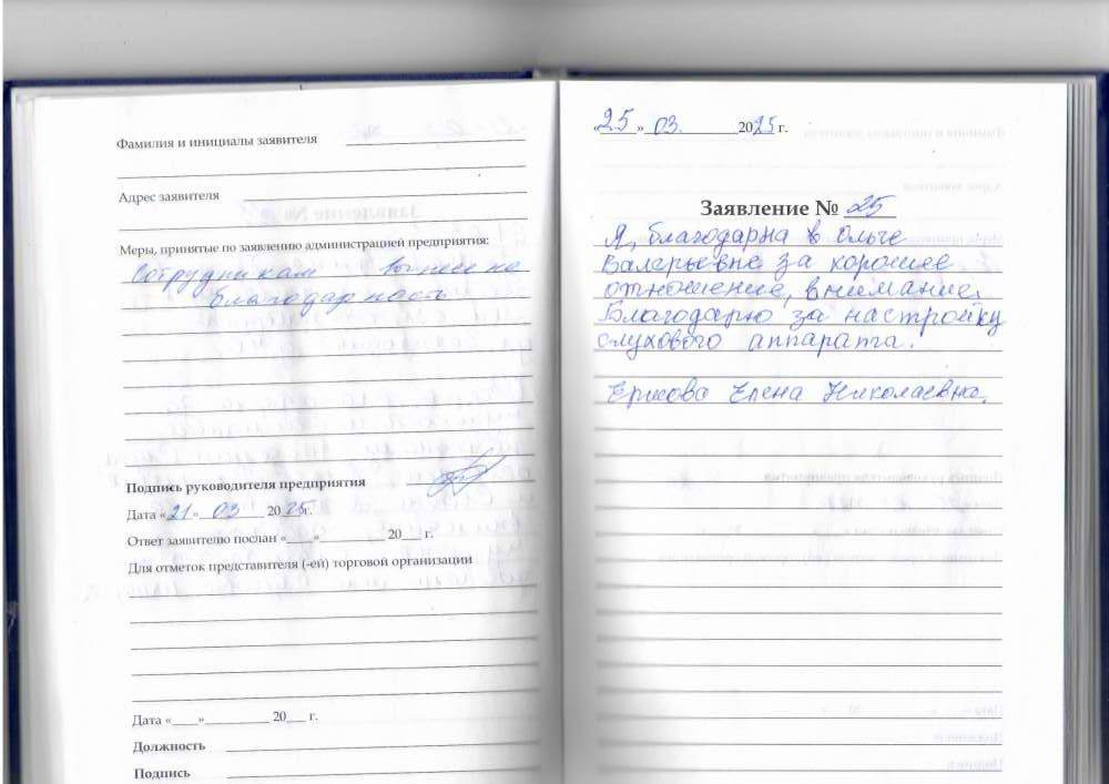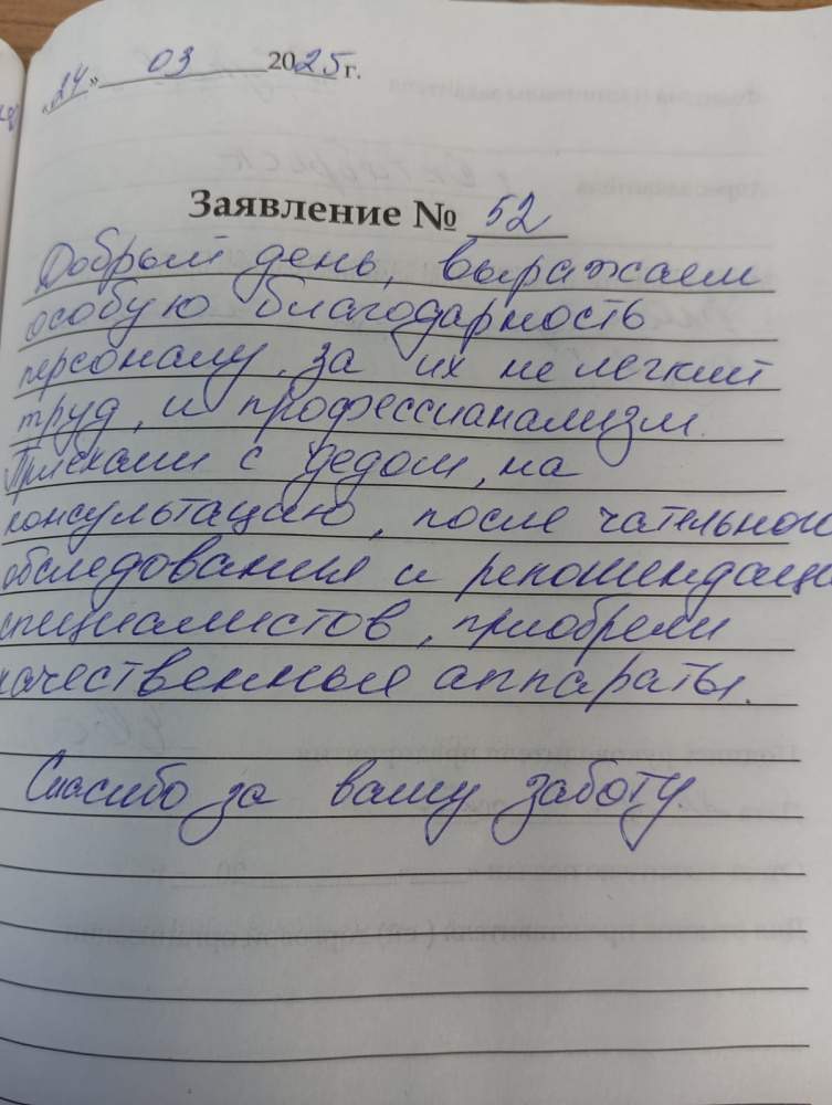 Добрый день. Выражаем особую благодарность персоналу за их не легкий труд, и профессионализм. Приехали с дедом , на консультацию, после тщательного обследования и рекомендаций специалистов,приобрели качественные аппараты. Спасибо за вашу заботу.