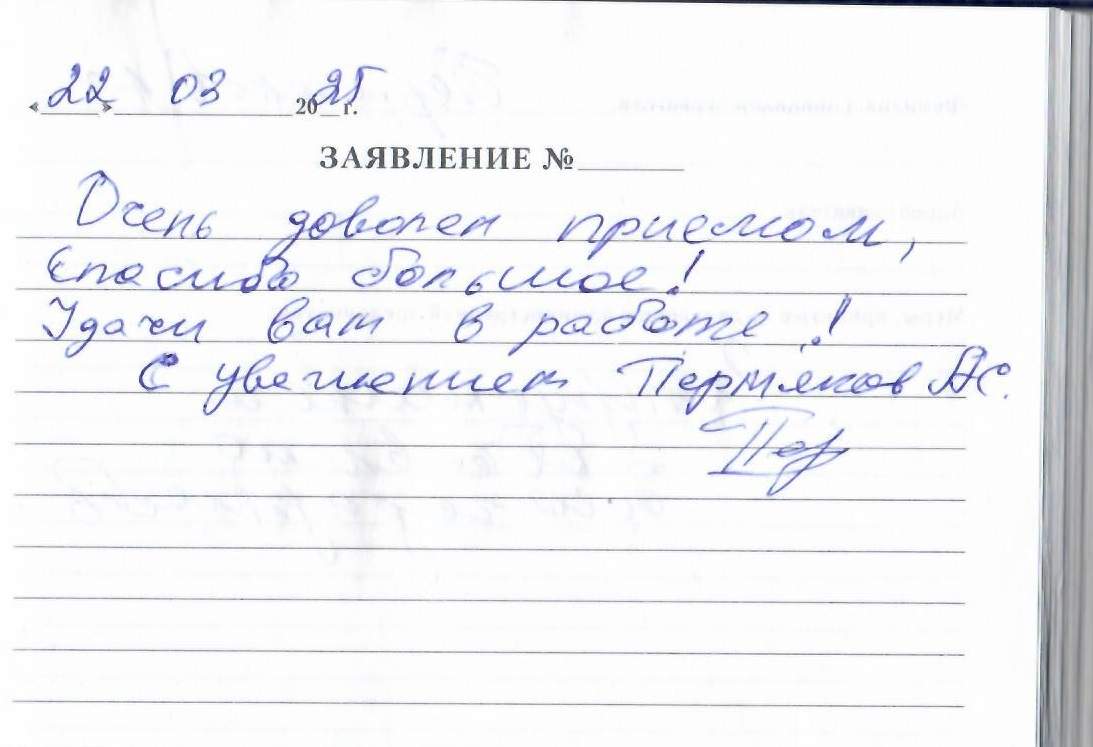 Очень доволен приемом, спасибо большое! Удачи вам в работе!