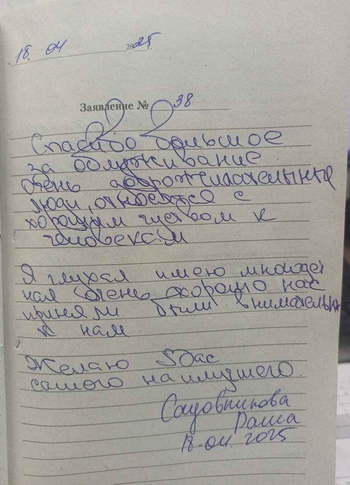 Спасибо большое за обслуживание очень доброжелательные люди, относятся с хорошим чувством к людям. Я глухая, многодетная, очень хорошо нас приняли, были внимательны к детям. Желаю для Вас самого наилучшего. Садовникова Раиса 18.04.2025