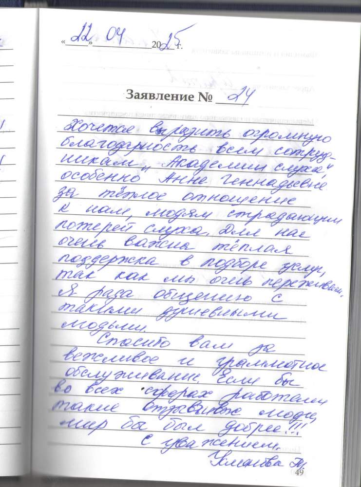 Хочется выразить огромную благодарность всем сотрудникам "Академии Слуха", особенно Анне Геннадьевне, за теплое отношение к нам, людям страдающим потерей слуха. Для нас очень важна теплая поддержка в подборе услуг, так как мы очень переживаем. Я рада общению с такими душевными людьми. Спасибо вам за вежливое и грамотное обслуживание. Если бы во всех сферах работали такие отзывчивые люди, мир бы был добрее!!! С уважением Усманова Т.