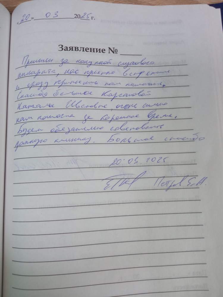 Пришли за покупкой слухового аппарата, нас приятно встретили и сразу принялись нам помогать. Спасибо большое Каргаловой Наталье Ивановне , очень сильно нам помогла за короткое время. Будем обязательно советовать данную клинику. Спасибо большое