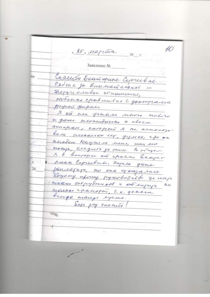 Спасибо Екатерине Сергеевне Рябчик за внимательное и терпеливое отношение, особенно, сравнивая с докторами другой фирмы. Я от неё узнала много нового и даже неожиданно о своём аппарате ,который я не использовала несколько лет ,думая, что он не годен. Научила меня, как его носить, следить за ним. В общем, я в восторге от приёма Екатерины Сергеевны. Хотела даже заплатить, но она отказалась .Поэтому прошу руководство ценить таких сотрудников и отметить не только грамотой ,т.к. деньги всегда теперь лучше. Ещё раз спасибо!