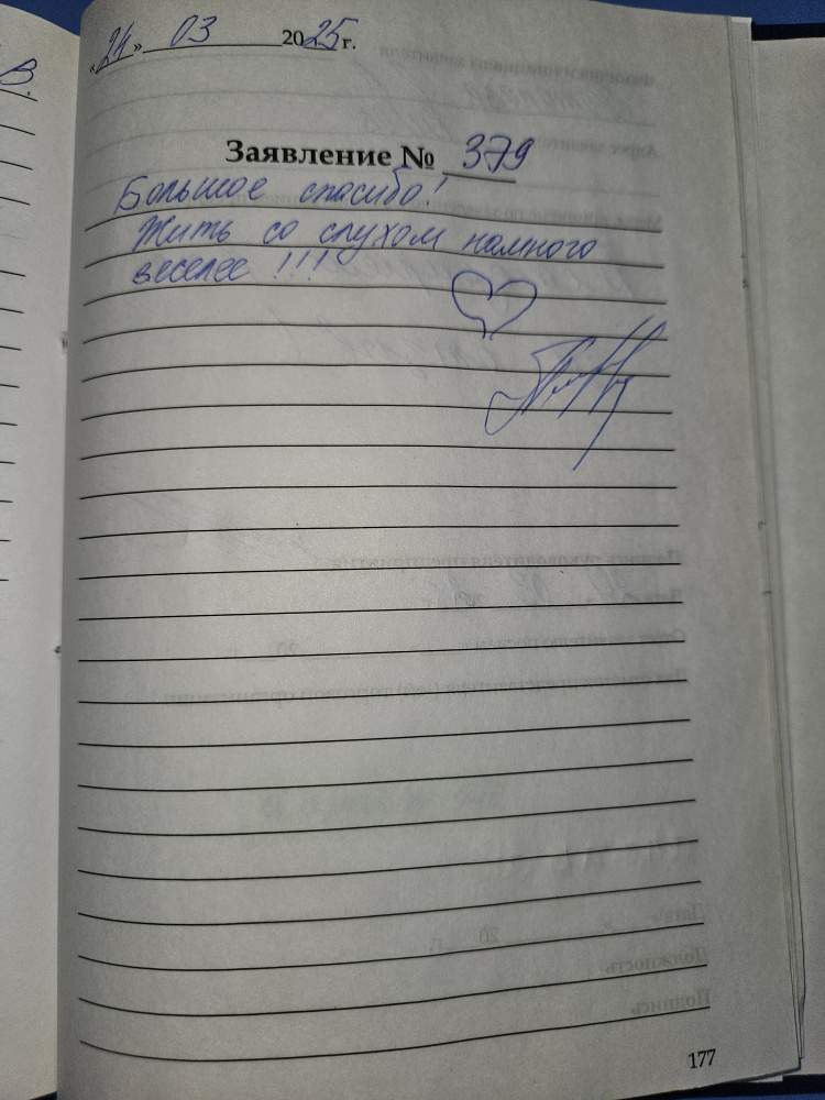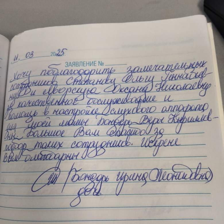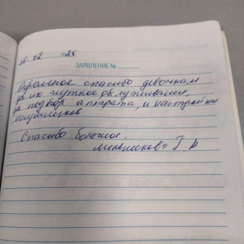 Огромное спасибо девочкам за их чуткое обслуживание, за подбор аппарата, и настройки наушников. Спасибо большое. Мельникова Г.А.
