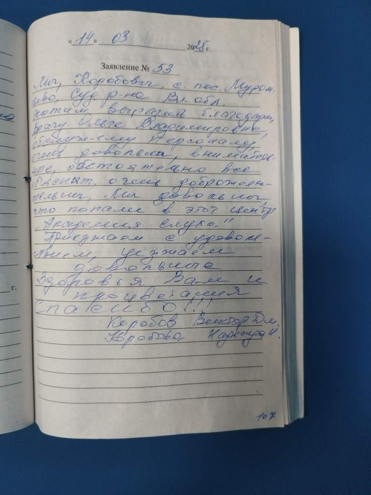 Мы, Коробовы, с. поселение Муромцево, Судогодского р-на Владимирской области хотим выразить благодарность врачу Ольге Владимировне, обслуживающему персоналу. Очень довольны, внимательно, обстоятельно все объяснят, очень доброжелательны. Мы довольны, что попали в этот центр "Академия слуха". Приезжаем с удовольствием, уезжаем довольные. Здоровья Вам и процветания. Спасибо!!!