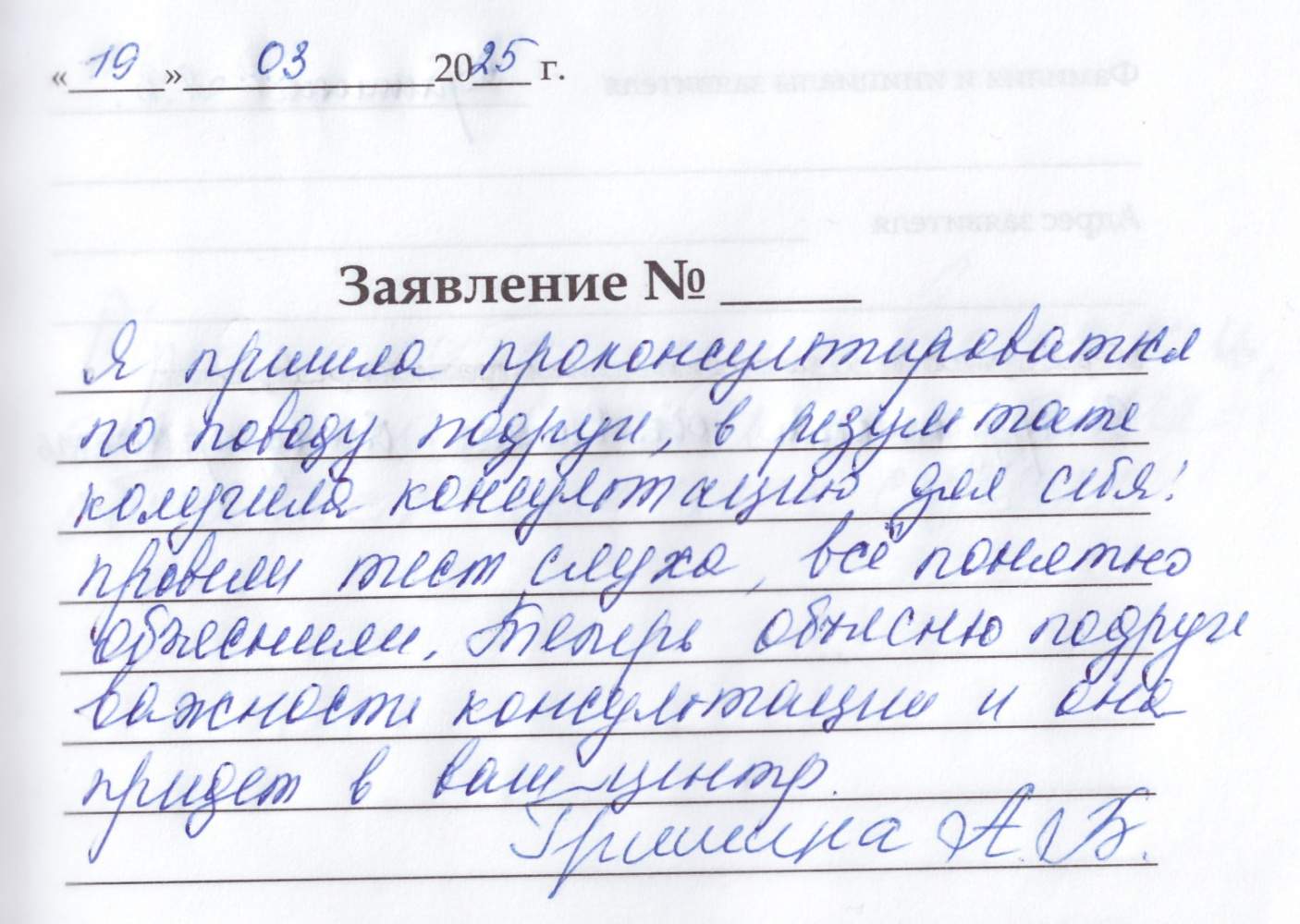 Я пришла проконсультироваться по поводу подруги, в результате получила консультацию для себя: провели тест слуха, всё понятно объяснили. Теперь объясню подруге важность консультации и она придет в ваш центр.