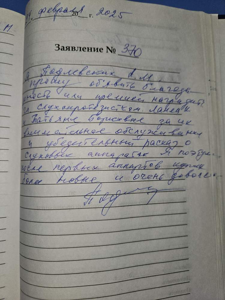Я, Подлевских А.М. прошу объявить благодарность или премией наградить гл. слухопротезистам Ланец Ирине  и Татьяне Борисовне за их внимательное обслуживание и убедительный рассказ о слуховых аппаратах. Я поэтому после первых аппаратов купил более новые и очень доволен. Подлевских А.М. г. Киров