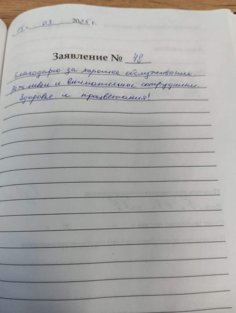 Благодарю за хорошее обслуживание. Вежливые и внимательные сотрудники. Здоровья и процветания!
