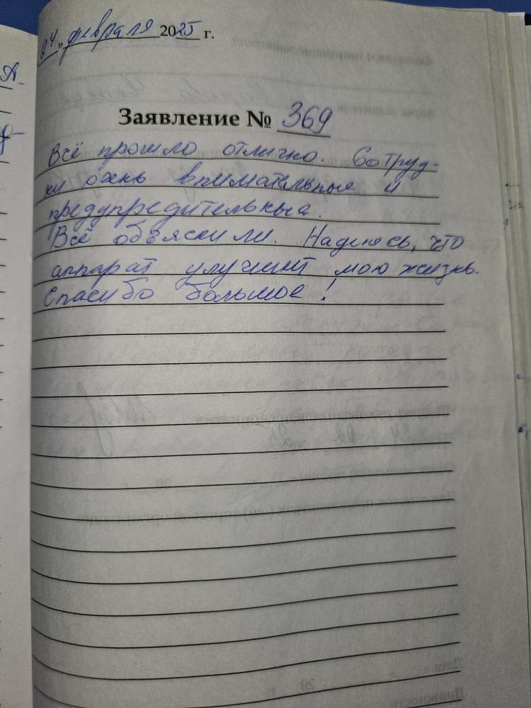 Все прошло отлично. Сотрудники очень внимательные и предупредительные. Все объяснили. Надеюсь, что аппарат улучшит мою жизнь. Спасибо большое! Осьмова Л.Н. г.Киров