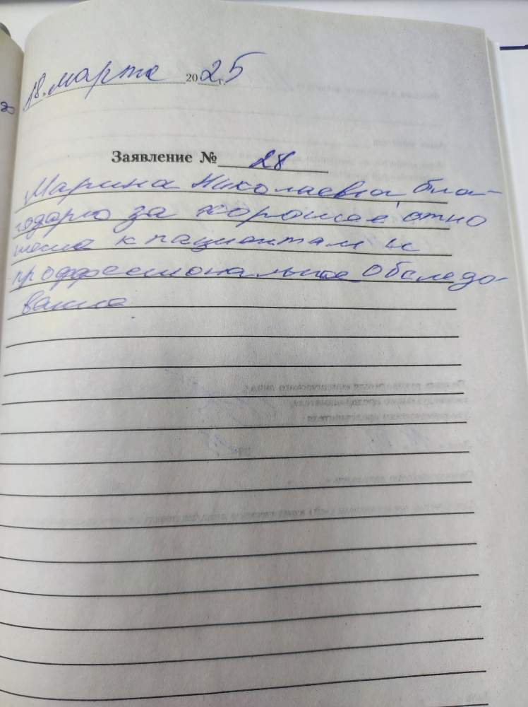 Марина Николаевна,благодарю за хорошее отношение к пациентам и профессиональное обследование.