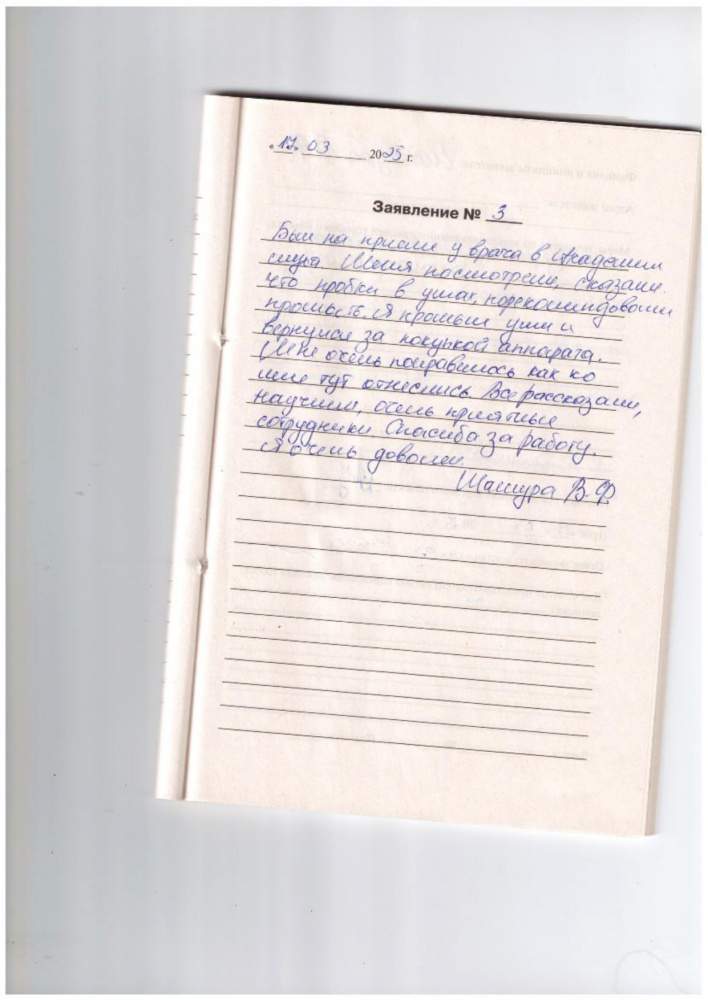 Был на приеме у врача в Академии слуха. Меня посмотрели, сказали что пробки в ушах, порекомендовали промыть. Я промыл уши и вернулся за покупкой аппарата. Мне очень понравилось как ко мне тут отнеслись. Все рассказали, научили, очень приятные сотрудники. Спасибо за работу. Я очень довольна.